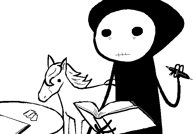 Death clicks his BALL POINT SCYTHE and jots down a few notes in his TOME OF WAYFARING SOULS.